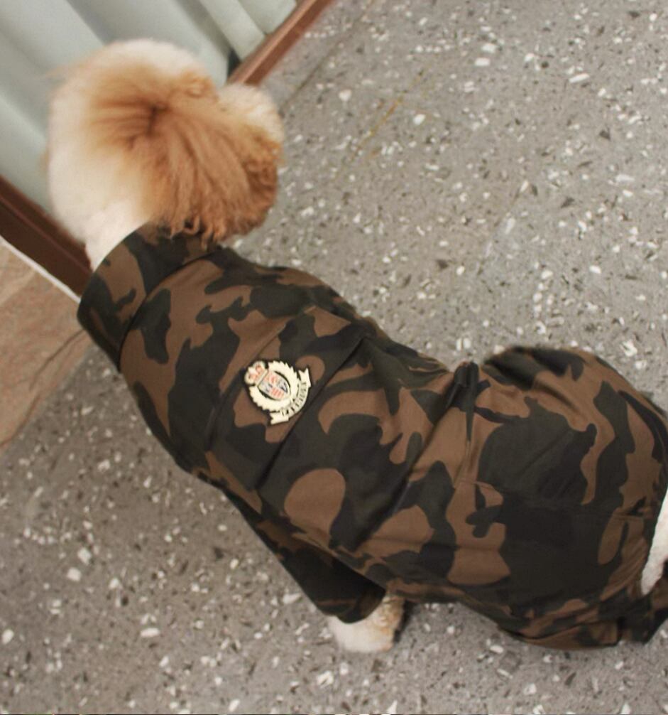 おしゃれで機能的な迷彩柄つなぎタイプのペットウェアです。