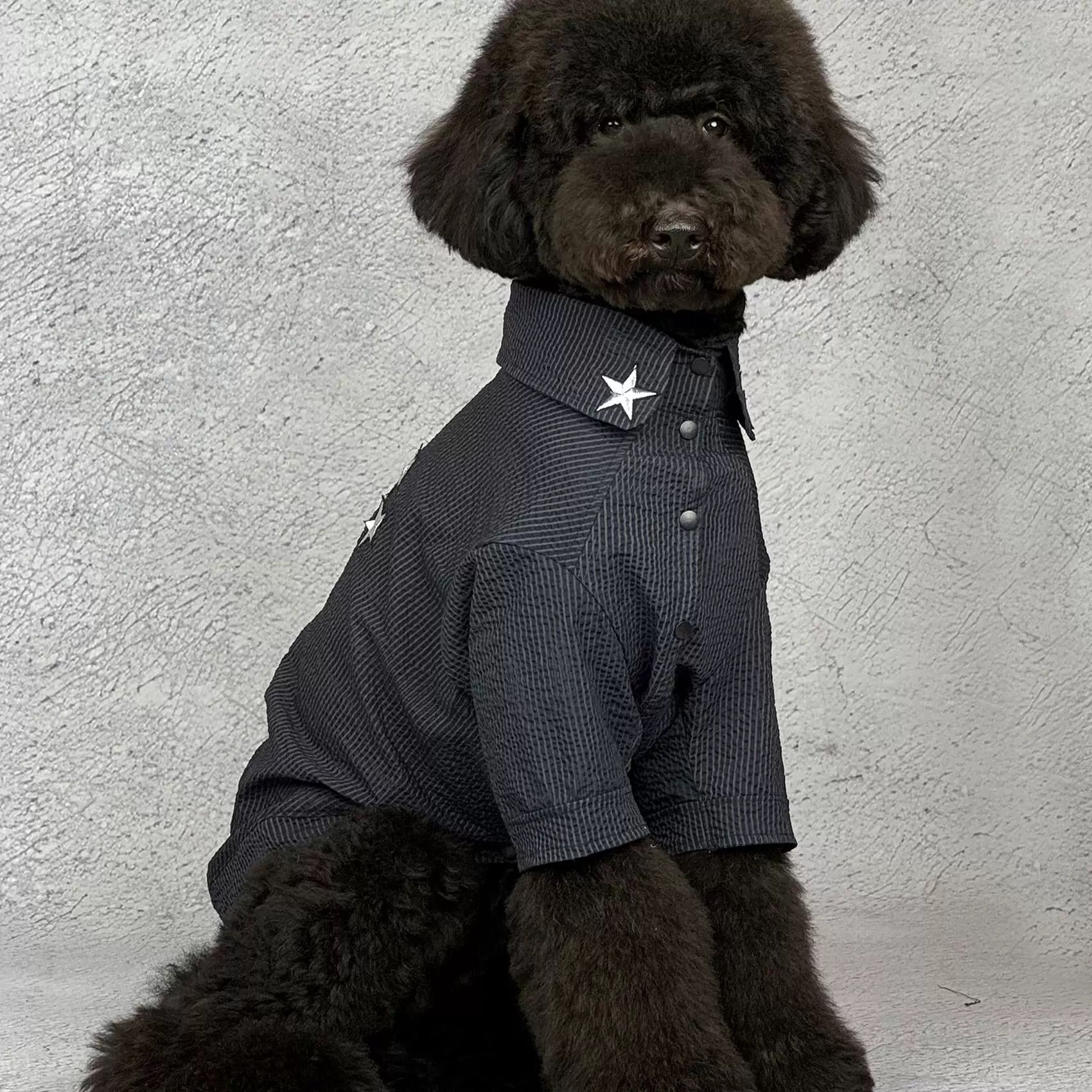 クールでスタイリッシュにきまる、ブラックシャツ風ドッグウェア。シンプルなチェック調の生地に、胸元と肩にあしらわれたスターのワンポイントがアクセント。落ち着いた色合いながらも存在感があり、愛犬をかっこよく引き立てます。