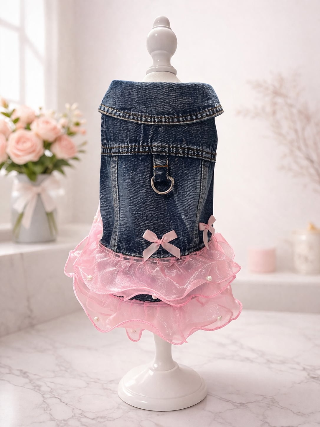 フリル付きデニムワンピース ピンク ブルー