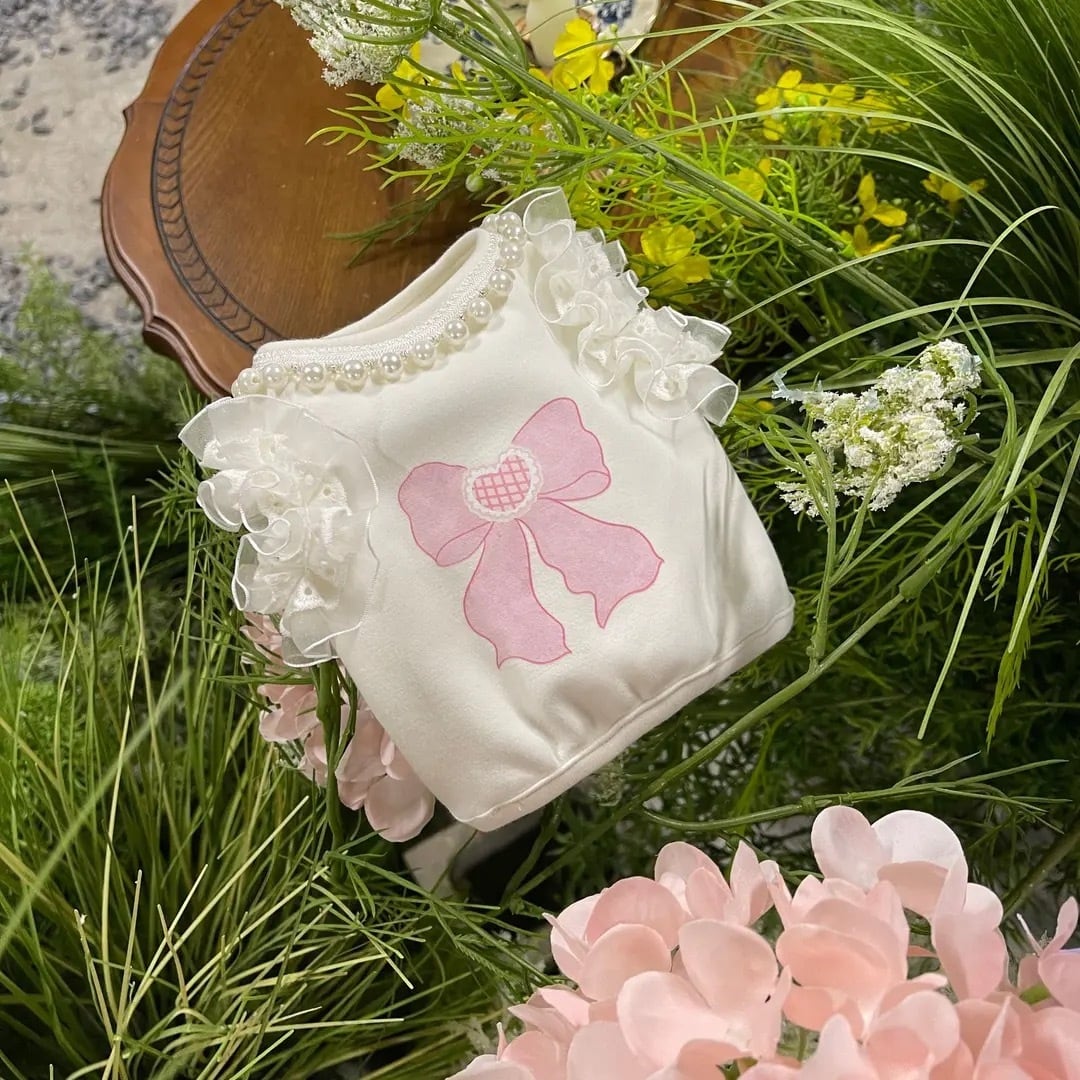 リボンのプリントと袖フリルがかわいい夏にピッタリなシャツです!